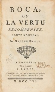 1756. LIBRO: (LITERATURA). HUSSON, MADAME: BOCA OU LA VERTU RÉCOMPENSÉE. Londres et Paris: Imp. Duchesne, 1756. 8º menor. 288 p. Cabeceras, capitales, páginas limpias. Rúbrica manuscrita de antiguo poseedor. Enc. en...