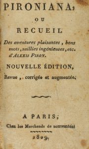 1813. LIBRO: (LITERATURA FRANCESA). PIRONIANA OU RECUEIL des aventures... d´Alexis Piron. Paris: Chez J. A. Joly Imp.-Ed., 1813. 12º. 1 h. + Frontis + 110 p. [Sigue]: GASCOGNIANA ou recuel des bons mots. Avignon: Id.,...