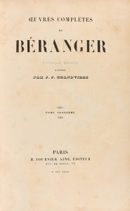 1839. LIBRO: (LITERATURA ERÓTICA). DE BERANGER, P.J. :. OUVRES COMPLÈTES DE P.J. DE BERANGER. Paris: Ed. H. Fournier Ainé, 1839. 3 vols. en 4º menor. I: 1 h. + LVI + 336 p. + 11 lám. II: 3 h. + 344 p. + 6 lám. III: 2...