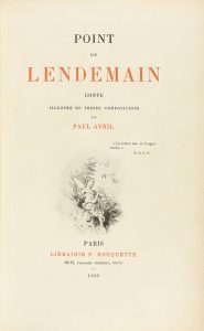 1889. LIBRO: (LITERATURA). AVRIL, PAUL: POINT DE LENDEMAIN. Paris: Imp. Georges Chamerot, 1889. 4º menor. 1 h. + VII p. + 38 p. Ilustr. con 12 lám. en el texto dibujadas por el autor. [Más:] NOTICE HISTORIQUE DUR...