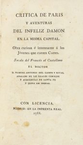 1788. LIBRO: (PARIS-SOCIEDAD). CAMPO Y RIVAS, MANUEL ANTONIO: CRITICA DE PARIS Y AVENTURAS DEL INFELIZ DAMON EN LA MISMA CAPITAL. Madrid: Imp. Real, 1788. 8º menor. 6 h. + 153 p. Enc. en media piel, corte superior...