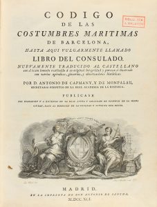 1791. LIBRO: (BARCELONA). CAPMANY Y DE MONPALAU, ANTONIO DE:. CODIGO DE LAS COSTUMBRES MARITIMAS DE BARCELONA, HASTA AQUI VULGARMENTE LLAMADO LIBRO DEL CONSULADO. Edición bilingüe del Consolat de Mar, con importantes...