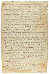 Galligans. Juicio por un terreno situado en la parroquia de Sant Martí de la Mota, que se decidió en Sant Pere de Galligans, entre Berenguera, mujer de Ramon d´Església y Pere Mir, ambos de la misma parroquia. Leve cerco de humedad y alguna pequeña falta que afecta dos palabras. Bonita caligrafía.