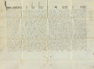 1352?. MANUSCRITO: (BULA PAPAL). BULA PROCLAMADA EN VILLANOVAM AVINOMENM PAPA INOCENCIO VI. Manuscrito sobre pergamino de 45 x 60 cm. Bula dada en Vilanova d´Avignó por el Papa Inocencio VI por la cual declara nulos los...