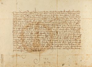 REX´. 13 de marzo de 1399. Dirigida a Pere Artés y su lugarteniente sobre el pago de los oficiales reales en el principado de Cataluña. Restos del sello de lacre. Pequeña falta de papel en el margen izquierdo del documento, no afecta texto.