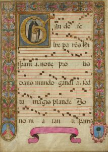 miniada con motivos florales. La música sobre tetragrama y de notación neumática cuadrada nos hace situarlo en el s. XIV, pues hasta el s. XV no se adoptó de forma generalizada el pentagrama, que coexistió desde el s. XIII con el tetragrama aquí usado. Probablemente extraídas de un cantoral de misa. Va acompañado de un fragmento de otro pergamino, también manuscrito y también miniado que, desafortunadamente, fue mutilado para servir de lomera en un una encuadernación.