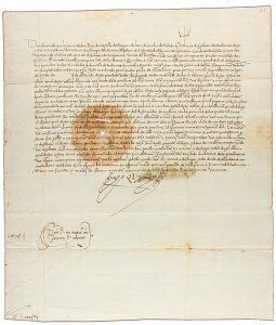 1490. MANUSCRITO: (FIRMA REAL). FIRMA REAL DE FERNANDO EL CATÓLICO. Manuscrito sobre papel, 35 x 31 cm. Fechado en Sevilla el 27 de febrero de 1490. Nombramiento de Pedro de Medina. Con el sello de lacre en un estado excelente....