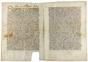 Abadía de Burgos, dado en noviembre de 1494. Primera línea con las letras doradas más grandes: ´Sepan qüantos esta carta publica de censo viesen como yo Lope de [Sanbitores], mercadero vecino de la muy noble y mas leal ciudad de Buros otorgo (...) que de mi propia y libre voluntad sin presion ni fuerza que nombro (...) a vos Pedro deputado la Abadía de Burgos...´.