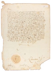 recibe Amador de Aliaga confiscados por la inquisición de Valencia por el delito de herejía. Conserva el sello de lacre.