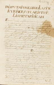s. XVIII. MANUSCRITO: DISPUTATIONES SCHOLASTISE INVNIBERSVM ARISTOT-LIS METAFISICAM. Manuscrito en 8º mayor. 317 p., un grabado. Parece todo de la misma mano aunque en diferentes momentos. Tratado de lógica aristotélica y...