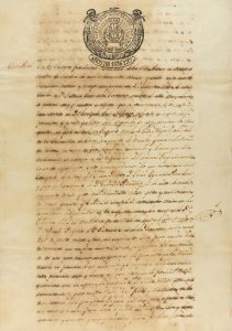 1827. MANUSCRITO: (ESCLAVITUD-CUBA). DOCUMENTO NOTARIAL SOBRE UNA VENTA REAL DE TIERRAS, FÁBRICA Y ESCLAVOS. La Habana, 24 de octubre de 1837. 1 pliego de 4 hojas con un sello húmedo y uno seco de Isabel II. Escrito notarial...