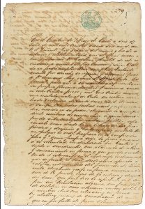 seco. Papel ligeramente tostado con taladros en el margen interior. Escritura notarial ante el Teniente juez Pedaneo sobre la venta por 800 pesos de una esclava natural de Cuba llamada Victorina de 25 años.