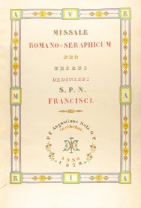 1870. MANUSCRITO: (MÚSICA-MISAL). SOLA, AGUSTÍN: MISSALE ROMANO SERAPHICUM PRO TRIBUS ORDINIBUS S.P.N. FRANCISCI. 1870. Gran folio. Portada + 204 p. con las partituras sobre pentagrama en rojo, notación cuadrada y...