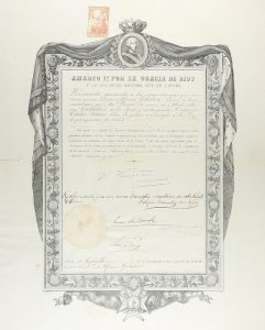 1871. MANUSCRITO: (FIRMA REAL). REAL ORDEN CON LA FIRMA ESTAMPILLADA DE AMADEO I. Real orden en folio mayor. Parte del texto impreso y enmarcado en una bonita orla grabada por Juan Estruch. Amadeo I nombra caballero de la orden...