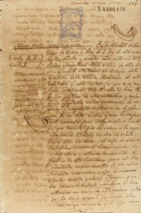 afecta texto. Escritura notarial con sello húmedo y numeración propia. Dª Maria Dolores Palacio otorga la libertad a su esclava criolla Marina de 25 años y a su hijo Jorge.