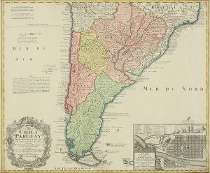 1733. MAPA: (CARTA NÁUTICA-CHILE-PARAGUAY). HOMANN, JOHAN BAPTIST: TYPUS GEOGRAPHICUS CHILI A PARAGUAY. Nuremberg: Homannianis Heredibus, 1733. 48,5 x 58 cm. Mapa grabado al cobre a doble página apaisada en papel...
