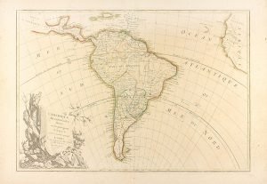 1762. MAPA: (SUR Y CENTRO AMÉRICA). JAUVIER: L´AMERIQUE MERIDIONALE DIVISÉE en ses principaux etats. Bordeaux: Chez Lattré graveur, 1762. Huella: 31,5 x 45,5 cm, papel: 38,5 x 51,5 cm. Mapa grabado al cobre a doble...
