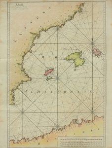 grueso papel verjurado con pequeña filigrana central en flor de lis. Huella: 82 x 60 cm, papel: 83 x 63 cm. Contiene: la costa catalana, valenciana, Islas Baleares y norte de Algeria. Algunos ligeros cercos de humedad en los márgenes.