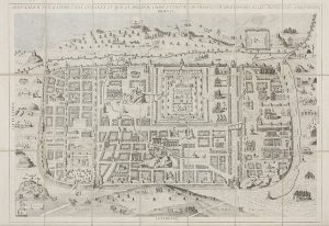 normalmente acompañaba la obra de Adrichomio, publicada por primera vez en Colonia en 1584. No hay muchas referencias de esta impresión castellana del mapa separado ni el siguiente, que situamos hacia 1800. Orientado hacia el Oeste, muestra un vista de todo el territorio de Tierra Santa dividido para las 12 tribus a ambos lados del Jordán y la línea de la costa que va de Sidón a Alejandría. En el mar se han situado algunos monstruos marinos. Este mapa fue referencia para la representación de Tierra Santa durante casi 200 años. Está entelado y en el doblez central la tela se ha rasgado, no afecta la imagen. [Sigue:] JERUSALEM SUS EXIDOS, Y LOS LUGARES EN QUE J. C. PADECIO COMO ENTONCES SE CONOCÍAN, SU DESCRIPCION ES DE... 56,5 x 81 cm. Plano de Jerusalem con los lugares emblemáticos, dentro y fuera de la ciudad, de los acontecimientos más importantes que se relatan en los evangelios de la vida de Jesús, y algunos otros tradicionales no mencionados en las escrituras. Christiano Adrichomio fue un sacerdote holandés, erudito de la Biblia y estudioso de los escritos de F. Josefo y muchos de los detalles que aparecen en el plano están basados en las observaciones del historiador romano. [Sigue:] MAPA DE LA TIERRA DE CANAAN, TIERRA DE PROMISION Y LAS 43 ESTACIONES DE LOS ISRAELITAS EN EL DESIERTO. 35 x 36,5 cm. Realizado a la pluma sobre papel que imita pergamino. Pequeña rasgadura en la parte superior que afecta ligeramente la leyenda. Raro conjunto de mapas, de especial interés por los dos de Christiano Adrichomio en castellano. Presentados en una petaca de piel con hilos dorados y tejuelo.