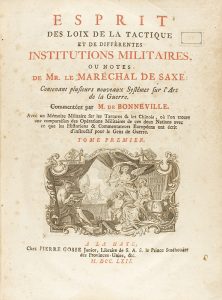 1762. LIBRO: (MILITARIA). MARÉCHAS DE SAXE: ESPRIT DES LOIX DE LA TACTIQUE ET DE DIFFÉRENTES INSTITUTIONS MILITAIRES. Comentarios por M. de BONNEVILLE. La Haye: Libr. Pierre Gosse Junior, 1762. 2 vol. en 4º. I: XVI p.+...