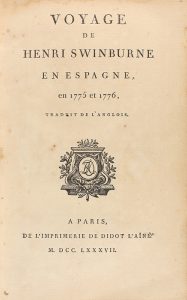 de Laborde , con fecha 1788. Ligera señal de óxido. Enc. de pasta española, lomera craquelada, cortes pintados. Primera Edición Francesa de la relación de Henry Swinburne (1752-1803), publicada inicialmente en Londres en 1779. Swinburne era un observador fino y ha consignado muchos hechos interesantes y curiosos. Debemos la traducción a Jean Benjamin de Laborde. Palau 325914.
