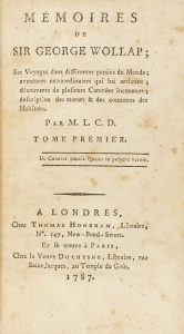 1787-1788. LIBRO: (VIAJES). M. L. C. D. MÉMOIRES DE SIR GEORGES WOLLAP; Ses voyages dans différentes parties du Monde... Londres, Paris: Libr. Thomas Hookham, Duchesne, 1787-1788. 3 vol. en 8º menor. I: 272 p. + 243 p....