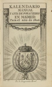 1805. LIBRO: (GUIA-MADRID). KALENDARIO MANUAL Y GUIA DE FORASTEROS EN MADRID PARA EL AÑO DE 1805. [Madrid: Imp. Real, 1805]. 12º. Lleva el mapa de Tomas López plegado y a color al principio + frontis grabado + 216 p. (ha...