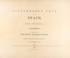 total de 20), dibujadas por Swinburne. Texto a dos columnas bilingüe en inglés y francés. Enc. en pasta española, doble tejuelo, nervios, ambos planos doblemente enmarcados con hierros dorados, ligeramente rozados. Pequeñas restauraciones en alunos márgenes, leves e intermitentes puntos de óxido. El ejemplar que presentamos incluye las siguientes imágenes: 1 mapa del la zona del viaje; Torre de Almenara; Oropesa; Barcelona; Ruinas del castillo de las Navas en Andalucía; Puente de Perpiñán; Málaga; Sevilla; Apartamento privado de la reina morisca en la Alhambra; Toledo; Dueñas; Valle de Margal; Burgos; Miranda del Ebro; Montesa; El Generallife; Fuerte de Bellegarde; Ruinas del Castillo de Puebla en Bizcaya; Puerta del Cid en Valencia. Todas las lám. acompañadas de texto bilingüe. Curiosamente, aunque la portada tiene fecha de 1806, las lám. datan del 1 de julio de 1808, posiblemente el texto ya estaría listo en 1806. Primera edición de estas bellas ilustraciones de ´Los viajes de Swinburne a través de España, 1775 y 1776´ que se publicaron en 1779 con 13 placas y mapas. En 1787 se reimprimió en dos volúmenes de octavo. Esta obra fue el primer libro de anticuario en Inglaterra sobre España. Exlibris de anterior propietario. Palau 325912.