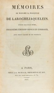 1816. LIBRO: (viajes-MEMORIAS). LAROCHEJAQUELEIN, MARQUISE DE: MÉMOIRES DE MADAME LA MARQUISE DE LAROCHEJAQUELEIN, ÉCRITS PAR ELLE-MÊME. Paris: Chez L. G. Michaud, 1816. 8º mayor. 1 h. + Un retrato + IV p. + 2 mapas...