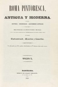 1840. LIBRO: (VIAJES). CHATEAUBRIAND; MENERBES; LAMARTINE. ROMA PINTORESCA, ANTIGUA Y MODENA. Barcelona: Imp. de Joaquin Verdaguer, 1840. 2 tomos en 1 vol. en 4º. 1 h. + 72 p. + 1 h. + 58 p. + 1 h. Profus. ilustr. con 77...