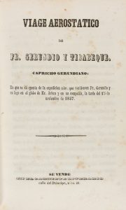 1847. LIBRO: (VIAJES). [LA FUENTE]: IAGE AEROSTATICO DE FR. GERUNDIO Y TIRABEQUE En que se da cuenta de la espedicion aérea en globo el 15 de noviembre de 1847. Madrid: Imp. de Mellado, 1847. 8º. 2 h. + III p. + 151 p. 6...