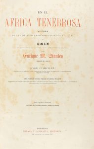 [1891]. LIBRO: (VIAJES). STANLEY, ENRIQUE M.: EN EL ÁFRICA TENEBROSA. HISTORIA DE LA EXPEDICIÓN EMPRENDIDA EN BUSCA Y AUXILIO. Trad. por José Coroleu. Barcelona: Espasa y Cía, Ed., 1891. Folio menor. 838 p. + XX p. +...