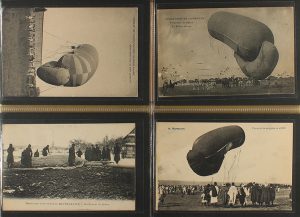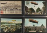 fotográficas de globos y zeppelines; 24 tarjetas en color de dibujos y composiciones de dirigibles; 76 postales en color de dirigibles sobrevolando diferentes ciudades; 69 postales fotográficas en b/n de dirigibles; 29 postales en b/n y color de globos aerostáticos.