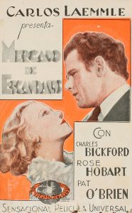 1933. PROGRAMA DE MANO: (CINE). CARLOS LAEMMLE PRESENTA MERCADO DE ESCANDALOS CON CHARLES BICKFORD, ROSE HOBART, PAT O´BRIEN. Díptico en color. 14 x 9 cm. Film presentado en el Teatro Guimera, Picarol Cinema. Pequeñas...
