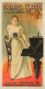 1900. CARTEL: (MÚSICA). CUSI, M.: PIANOS ESTELA (ANTIGUA CASA BERNAREGGI). [Barcelona]: Llacuna Cromolit., Lit. Henrich y Cia., 1900. 109 x 59 cm (42,8 x 23,2 in). Cartel publicitario realizado por M. Cusi. Presenta...
