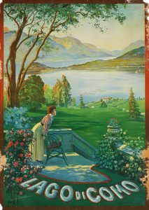 1900 ca. CARTEL: (TURISMO). XIMENES, ELIO: LAGO DI COMO. Genova, S.A.I.G.A Armanino, 1900 ca. 99 x 70 cm. (39 x 27,5 in) Cartel cromolitográfico. Rasgadura, pequeñas faltas y pintura desconchada en los márgenes. Offset B.