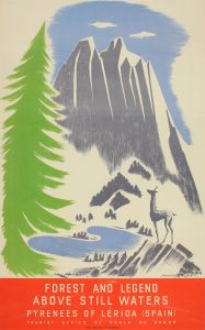 1940 ca. CARTEL: MONENY: FOREST AND LEGEND ABOVE STILL WATERS PYRENEES OF LÉRIDA (SPAIN). Barcelona: Seix i Barral. 98 x 62,5 cm (38,5 x 24,5 in). Cartel cromolitográfico realizado por Moneny. Entelado. A.