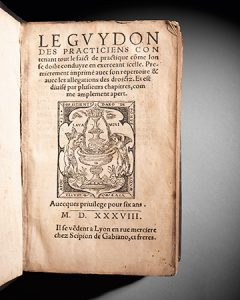 [DOLET, Étienne] Le Guydon des Practiciens contenant tout le faict de practique comme lon se doibt conduyre en exerceant icelle Lyon, Scipion de Gabiano, 1538 EXEMPLAIRE EN RELIURE DE L'ÉPOQUE DE CE MANUEL DE DROIT PRATIQUE, DONT L'ÉDITION EST DUE...