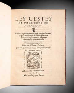 "Dès 1538, alors qu'il n'a pas encore mis le point final à son monumental dictionnaire latin, Dolet annonce sa décision de consacrer désormais le reste de sa vie à écrire l'histoire de son temps ; et dans l'épître à François Ier qui précède le tome II des Commentaires, il s'emploie à convaincre le souverain de son entreprise et à solliciter son appui. Sans doute pour le fléchir en lui montrant ce dont il est capable, il lui dédie quelques mois plus tard un petit volume in-4° de 80 pages intitulé Francisci Valesii Gallorum Regis Fata... dans lequel il s'efforce de résumer en hexamètres latins la politique extérieure de la France" (Longeon, Préfaces françaises, pp. 65-66).