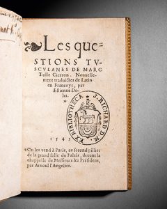 CICÉRON - Les Questions tusculanes de Marc Tulle Ciceron. Nouvellement traduictes de Latin en Francoys, par Estienne Dolet Paris, Arnoul L'Angelier, 1543 ÉDITION RARE DE LA TRADUCTION PAR ÉTIENNE DOLET, PARUE LA MêME ANNÉE QUE L'ORIGINALE....