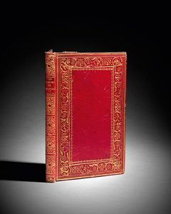 Maroquin rouge à grain long, décor doré, large roulette en encadrement, filets et guirlande, dos long richement orné et doré, doublure et gardes de tabis bleu, tranches dorées