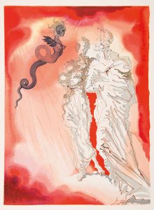 Salvador Dali gravées sur bois en couleurs par Raymond Jacquet. Traduction de Julien Brizeux. Un des 3500 exemplaires sur vélin pur chiffon de Rives (No 4316), Tirage total 4765 ex. Ce projet d’édition de 100 aquarelles destinées à illustrer l’œuvre de Dante devait au départ être entrepris par la Libreria dello Stato à Rome. Le contrat ayant été dénoncé, ce sont Les Heures claires qui vont racheter les droits de reproduction. Celles-ci seront gravées et imprimées sous la direction de Jean Estrade. Les 100 aquarelles seront exposées à Paris au musée Galleria. Cette importante publication suscite toujours un grand intérêt.