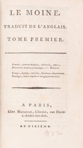 [LEWIS (Matthew Gregory)]. - Le Moine. Paris, Maradan, an dixième (1802). 4 tomes en 2 vol in-18, 182-185, 168-188 pp., veau blond marbré, dos lisse richement orné et doré, pièces de titre de maroquin rouge, coupes dorées. Bel exemplaire....