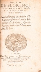 MACHIAVEL (Nicolas). - Histoire de Florence de Nicolas Machia- vel, cittoyen et secrétaire de ladite ville. Nouvellement traduicte d’Italien en François par le Seigneur de Brinon, Gentil-homme ordinaire de la chambre du Roy. Paris, Toussaint du...