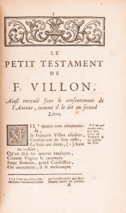 Première édition critique des œuvres de Villon, donnée par Eusèbe de Laurière et le père du Cerceau. Contenant les oeuvres, Le petit testament de François Villon, Lettres à Monsieur de ***.