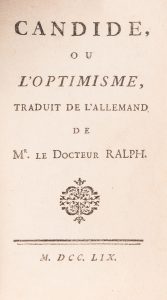 [VOLTAIRE]. - Candide ou L’optimisme, traduit de l’allemand de Mr. le docteur Ralph. S.l., s.n., 1759 In-12 : 237-(3) pp., veau brun, dos à faux nerfs orné et doré (coiffe supérieure restaurée, dorure un peu passée), coupes dorées,...