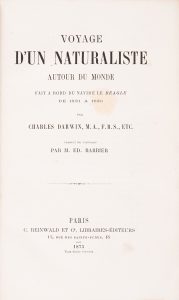 DARWIN (Charles Robert). - Voyage d’un naturaliste autour du monde fait à bord du navire le Beagle de 1831 à 1836. Suivi de : Catalogue des livres de fond de C. Reinwald. Paris, C. Reinwald, 1875, In-8, (2)-VIII-552-20 pp., percaline verte...