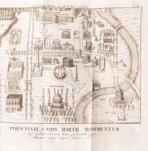 La Haye, Frédéric Staatman, 1764, petit in-4, veau blond flammé, dos lisse richement orné et doré, pièce de titre de maroquin rouge, roulette dorée en filet doré en encadrement autour des plats, coupes dorées, tranches paille mouchetées. Frontispice, 3 planches repliées, 89 vues de monuments, 15 figures de médailles. Exemplaire en belles conditions.