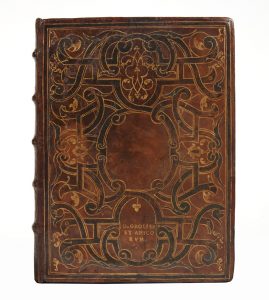 Veau havane, dos à nerfs orné de caissons de filets dorés, plats recouverts d'un décor d'entrelacs de cire noire sertis de filets dorés avec fleurons dorés ; inscriptions en lettres dorées, sur le premier plat dans la réserve en pied :