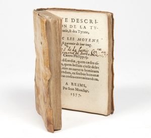 [LA BOÉTIE, Étienne de.] Vive description de la tyrannie, & des Tyrans, avec les moyens de se garentir de leur ioug. À Reims, par Jean Mouchar [Bâle], 1577. In-16 [104 x 68 mm] de 96 pp. : Vélin ivoire souple à petits rabats (reliure de...